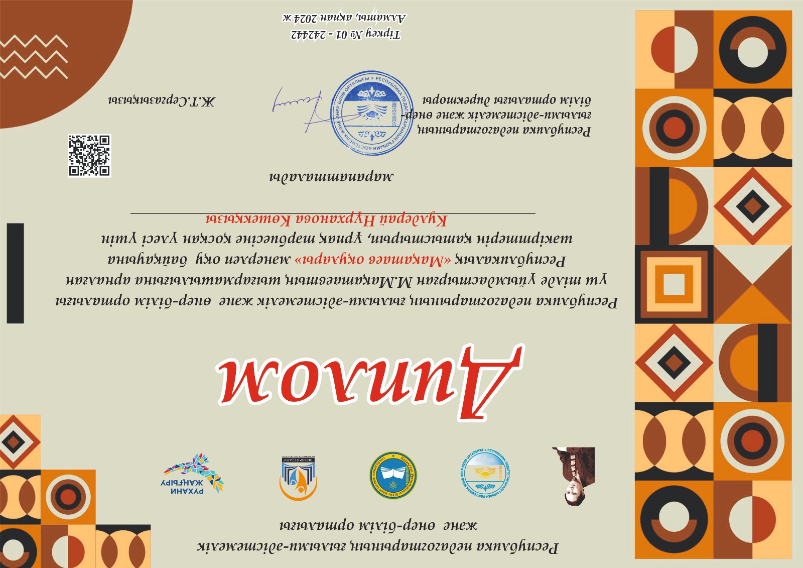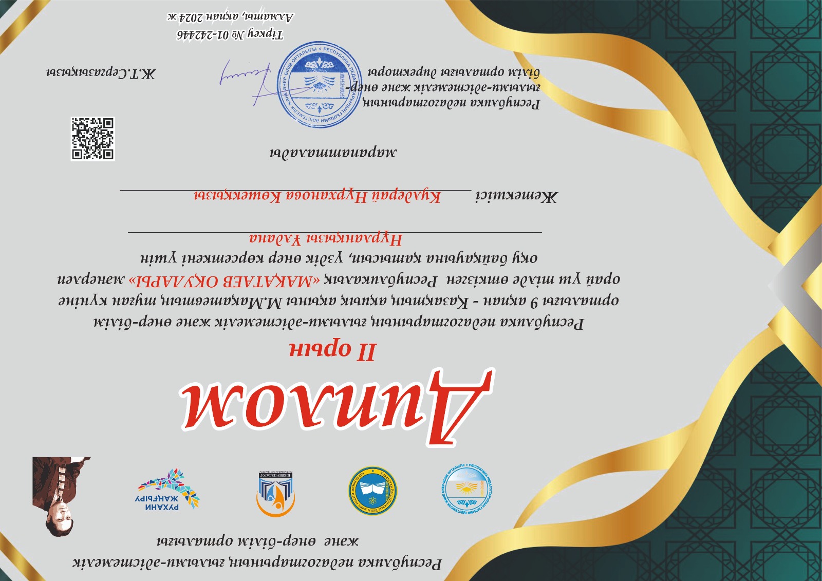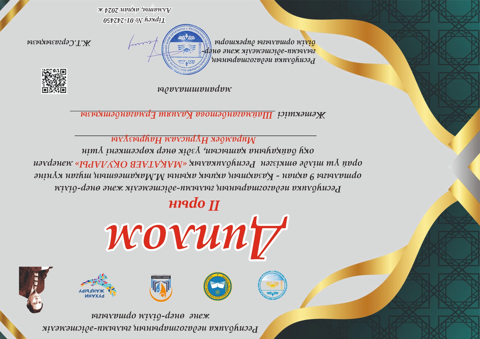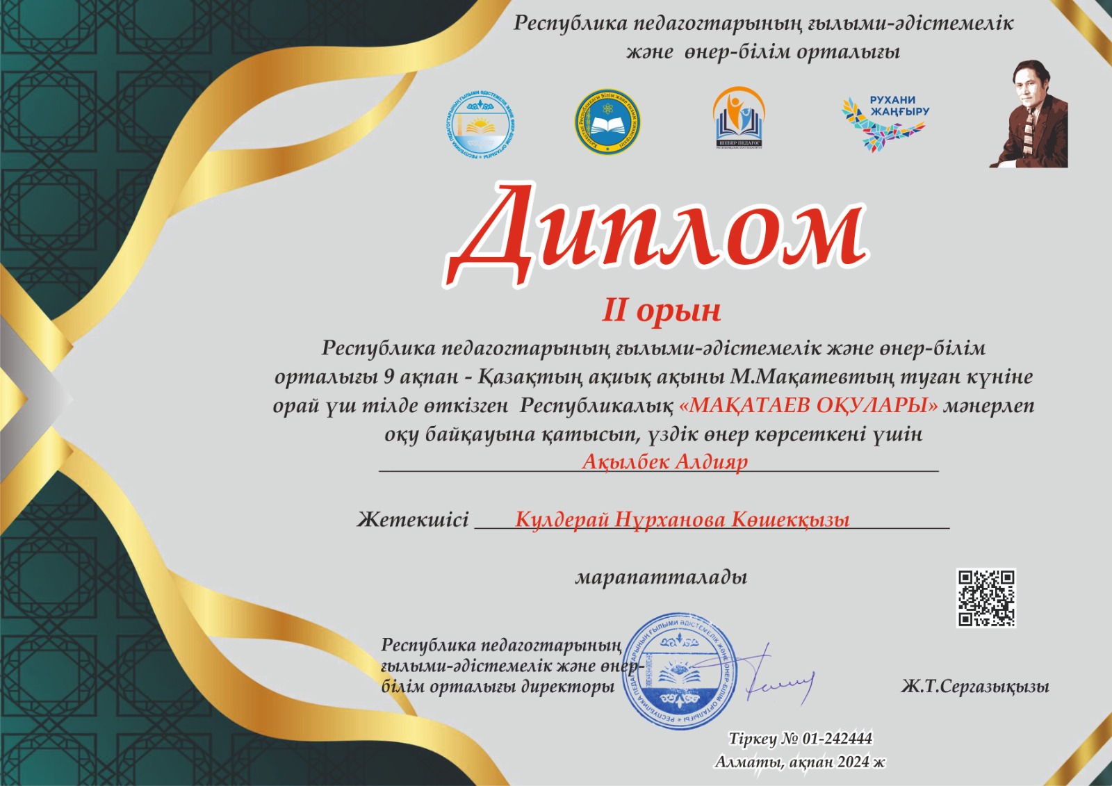 Қазақтың ақиық ақыны М.Мақатаевтың туған күніне орай үш тілде өткізілген Республикалық "Мақатаев оқулары" мəнерлеп оқу байқауының жеңімпаздарын жəне жетекшілері Нұрханова Күлдарай Көшекқызы мен Шаймағанбетова Қалияш Ермағанбетқызын құттықтаймыз!