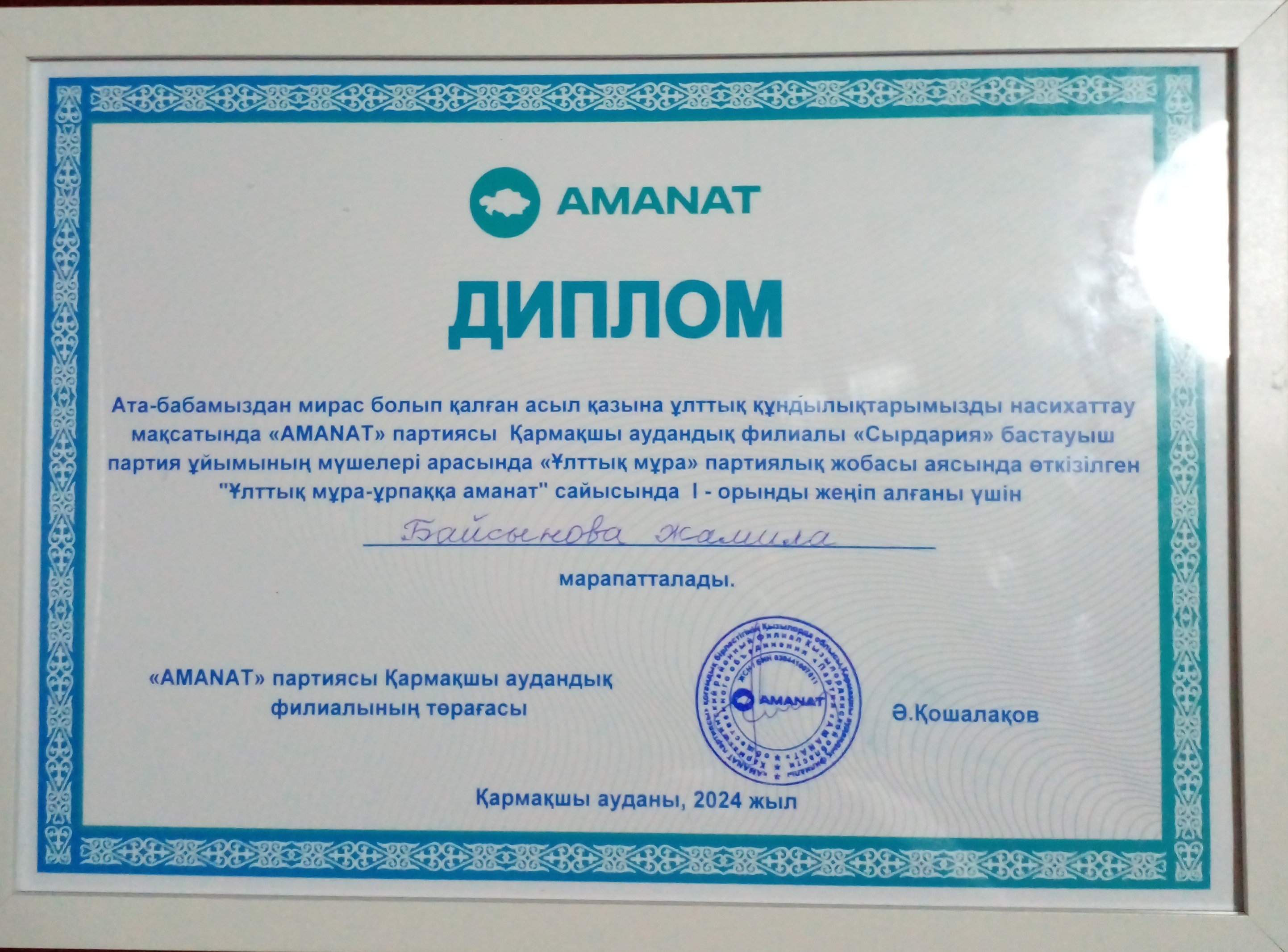 Аудандық жыраулар үйінде өткен "Ұлттық мұра- Ұрпаққа аманат" атты байқауына N1санаториялық бөбекжай-бақшасы тəрбиешісі Байсынова Жамила Сардарбекқызы қатысып жүлделі 1 орынды иеленді.