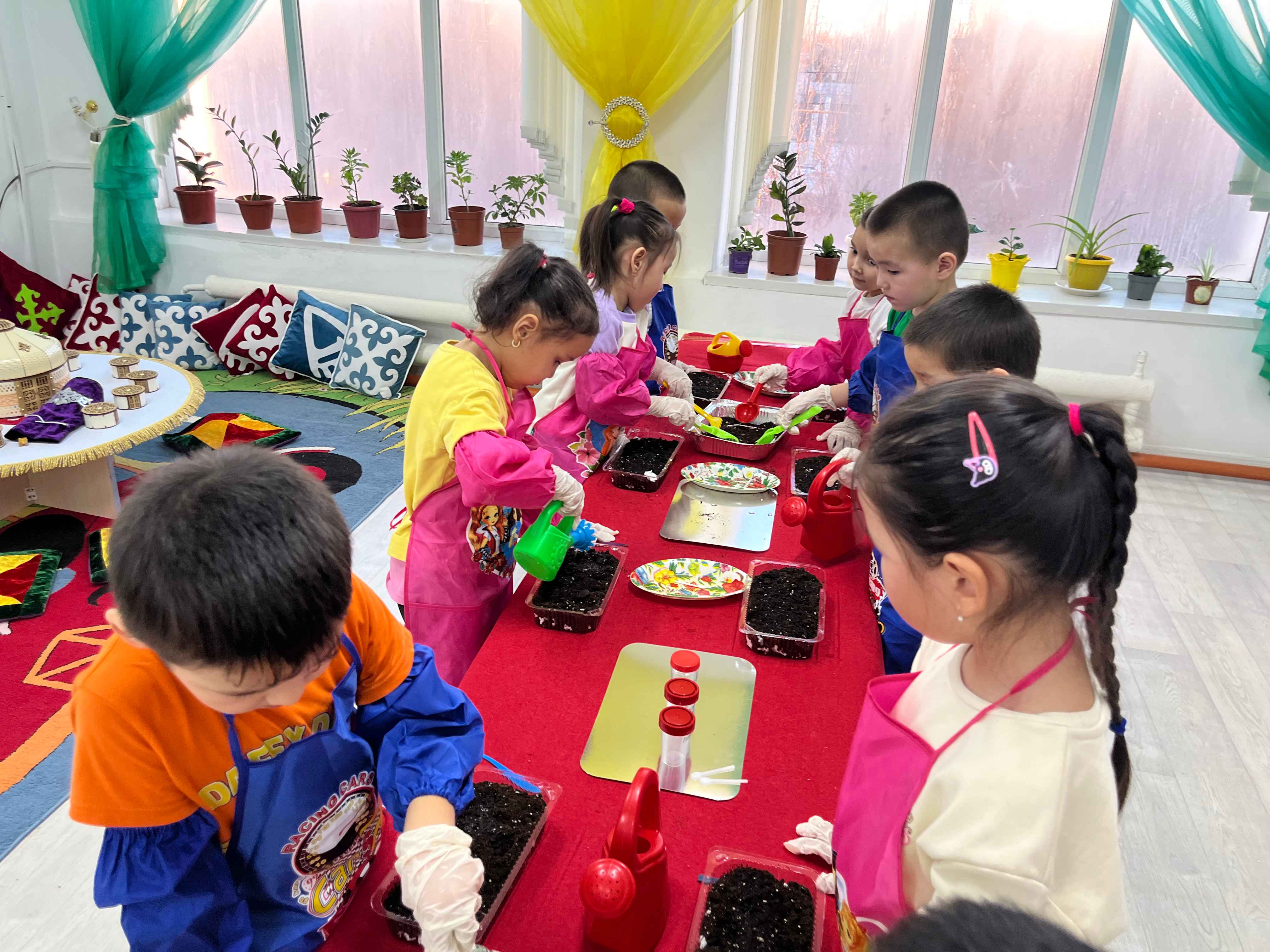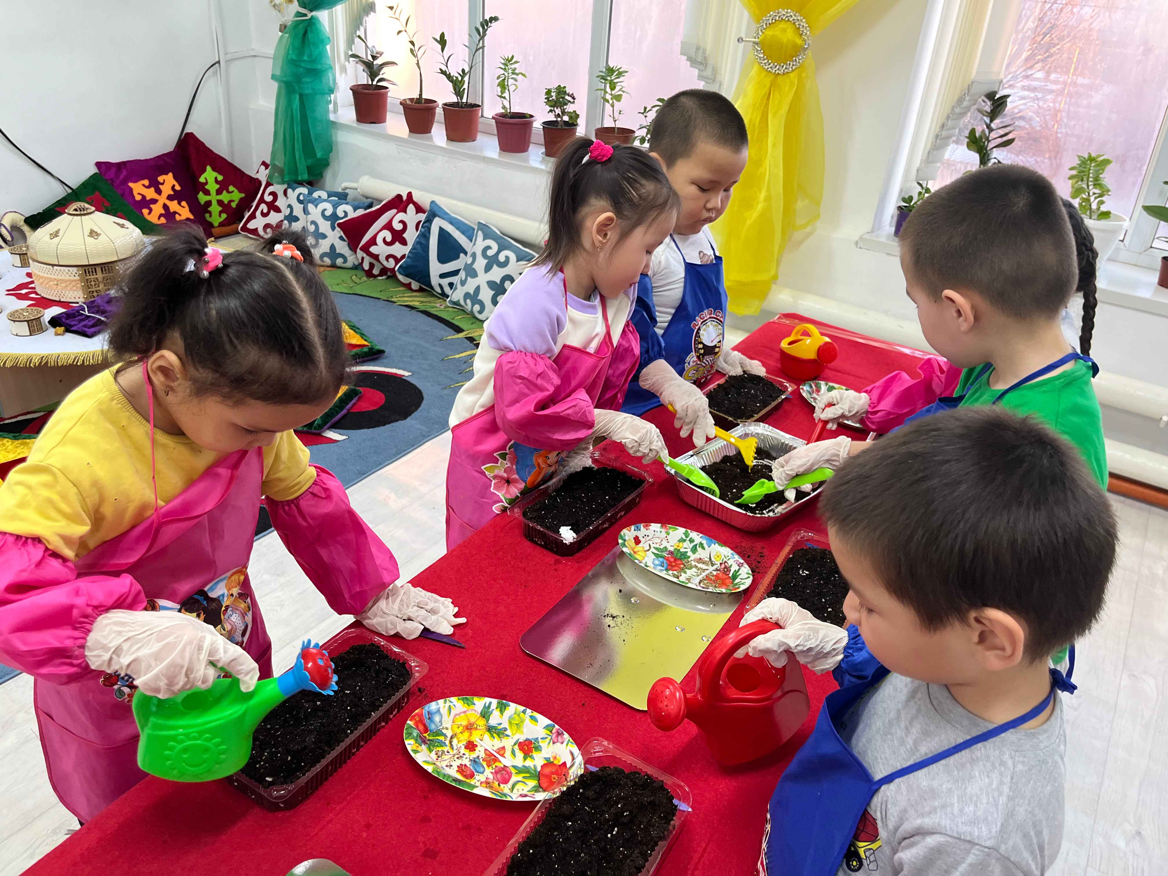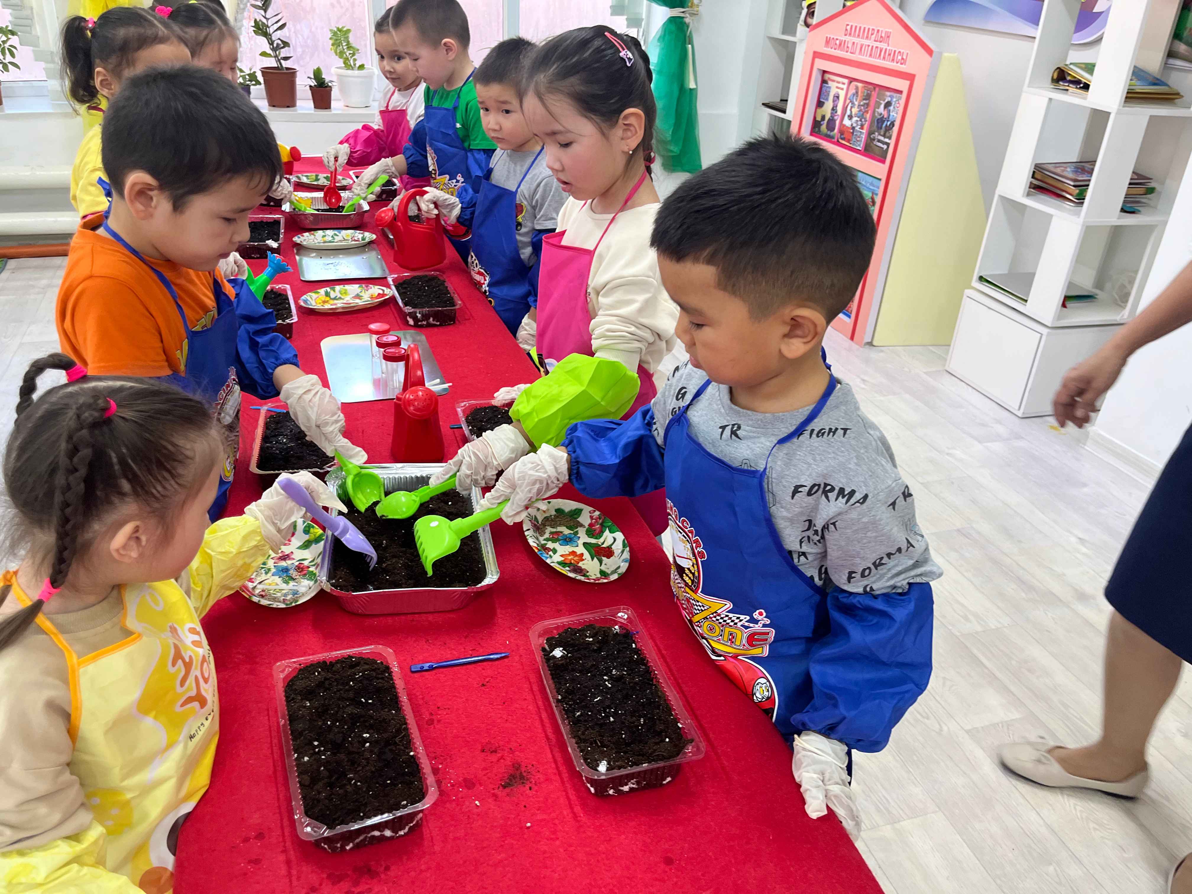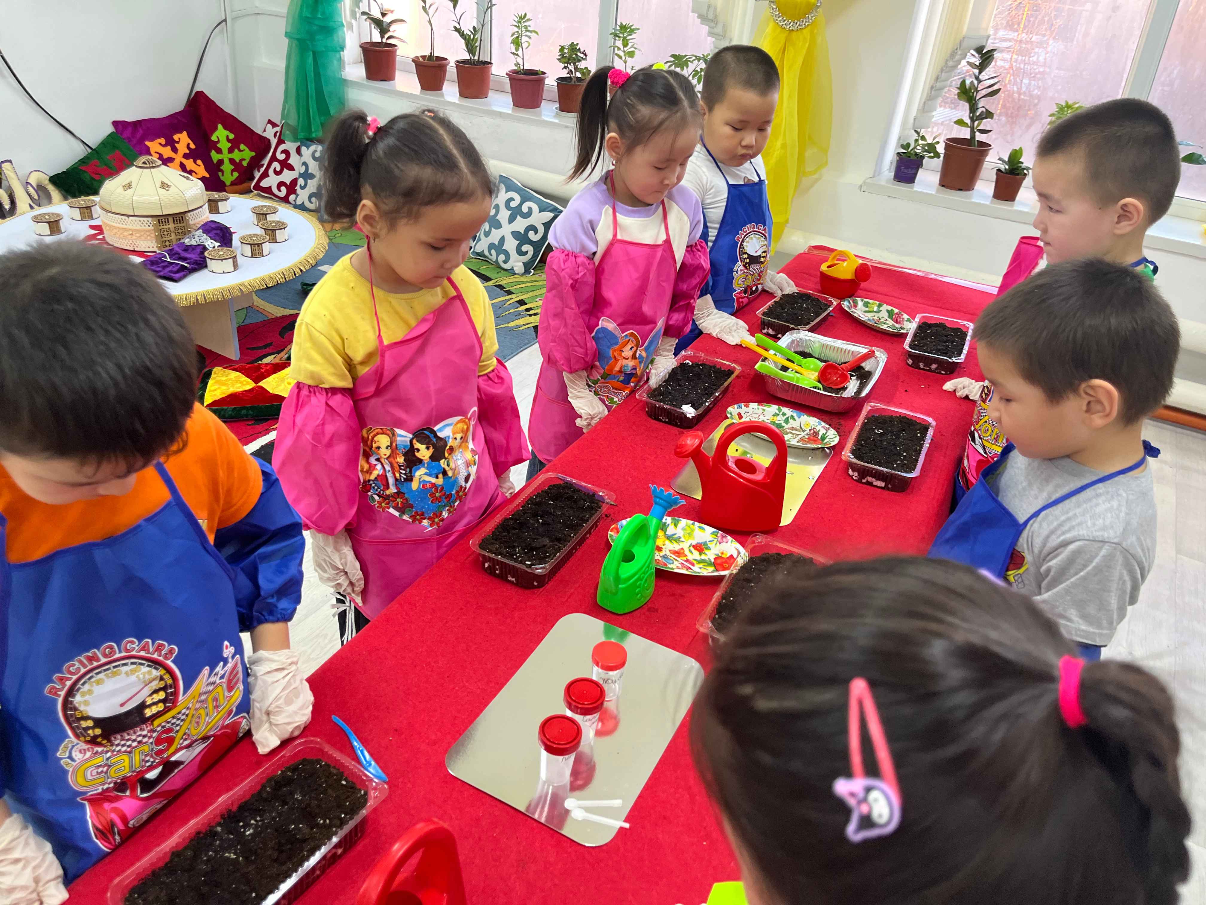 “Жасыл әлем-кішкентай зерттеушілер” тақырыбындағы жоба аясында Мектепалды “Шапағат” топ тәрбиеленушілері достарымен бірге күнделікті тағамға қажетті аскөктер тұқымдарын егу жұмыстарын жалғастыруда