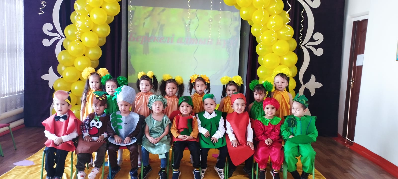 Қуаныштың ағайын,Қоңырауын соғайын.Қуандырып біздерді,Өлкемізге күз келді!1 санаториялық бөбекжай-бақшасыКүзгі табиғатты бейнелейтін əн мен биден шашу шашып, күз мезгілінің ерекшеліктерін айқындайтын өлең шумақтарымен көрермендерді қуантты.
