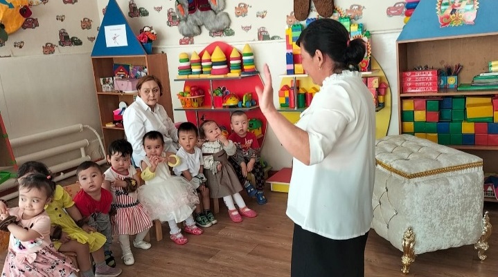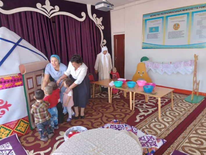 1 санаториялық бөбекжай-бақшасының "Аққоян" ерте жас тобының тəрбиешісі Аманжолова Айымкүл Рзахметқызы "Менің əжем", "Əжемнің орамалы" тақырыптарында кіріктірілген іс-əрекетін ұйымдастырды