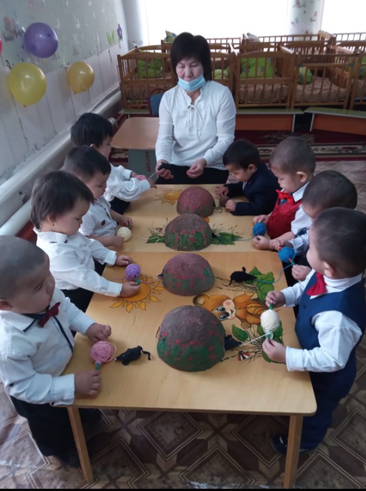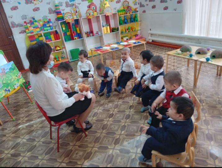 Балалардың үй жануарларын танып, даусына еліктеу, дыбыстарын қайталату арқылы сөздік қорды молайту мақсатында коммуникативтік дағдыларын дамытты.Іс-əрекетті ойын түрінде ұйымдастырып "Мысықтың жолы" ,"Мысыққа көмек", "Аулаушылар" ойынын ойнағанда балалар тəрбиешіні тыңдап, түсініп, түрлі тапсырмаларды жас ерекшеліктеріне қарай керемет орындады.Тəрбиеші шығармашылық əрекет түрлеріне балалардың бойындағы қызығушылықтарын оятып, қоршаған орта туралы түсініктерін байытты.