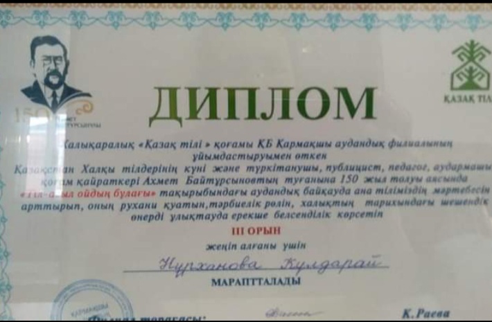 ның тəрбиешісі Нұрханова Күлдарай Көшекқызы Халықаралық "Қазақ тілі" қоғамы ҚБ Қармақшы аудандық филиалының ұйымдастыруымен өткен Қазақстан халқы тілдерінің күні жəне түркітанушы, публицист, педагог, аудармашы, қоғам қайраткері Ахмет Байтұрсыноатың туғанына 150 жыл толуы аясында "Тіл- ақыл ойдың бұлағы" атты аудандық байқауда өнер көрсетіп, жүлделі 3 орын иеленді. Əріптесімізге шығармашылық табыс пен шабыт тілейміз.