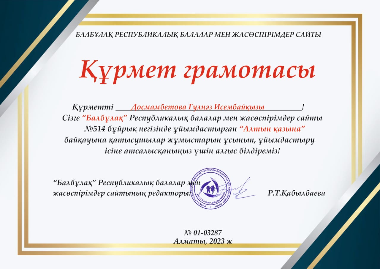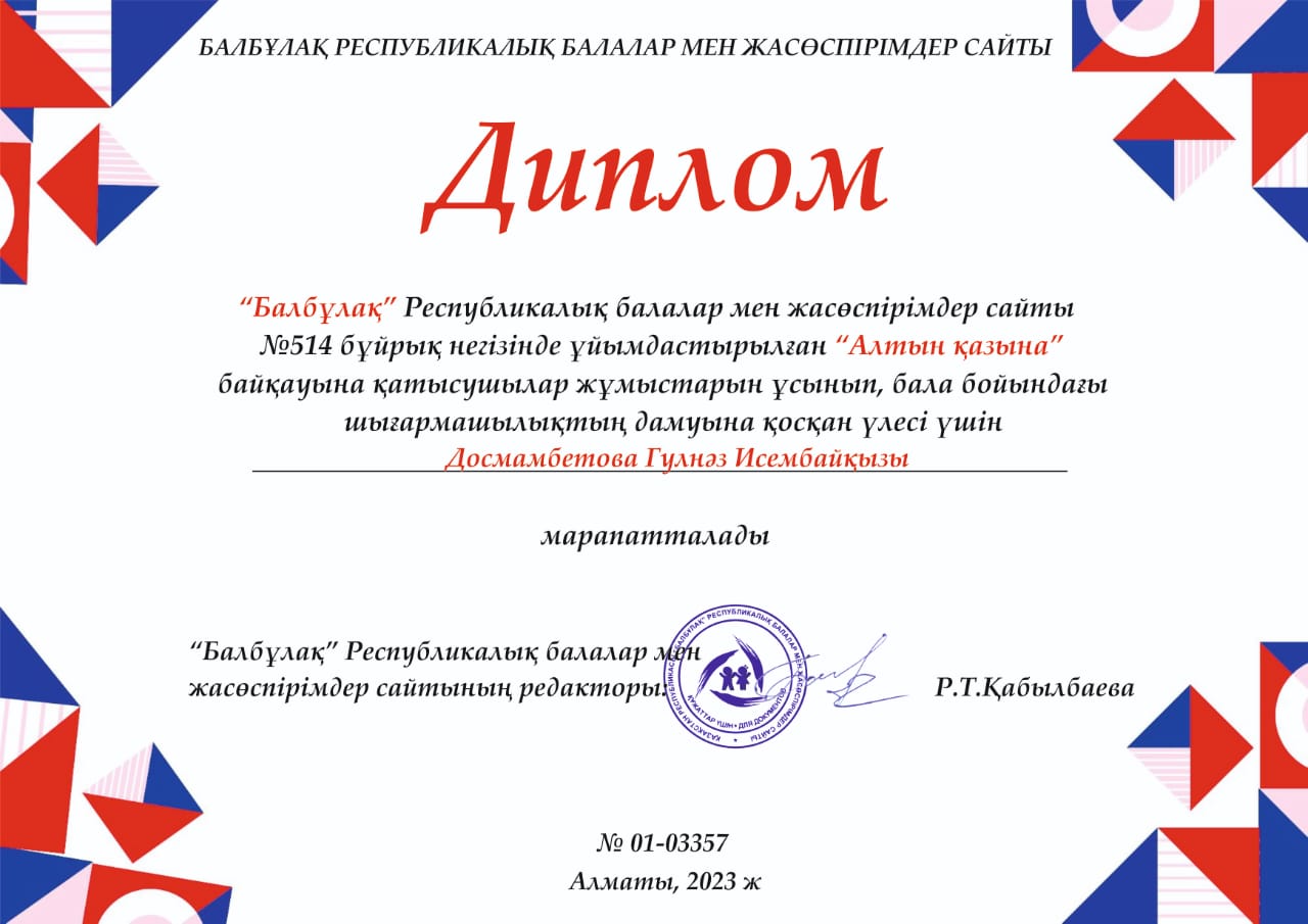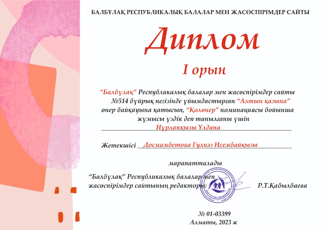 № 1 санаториялық бөбекжай-бақшасы,"Балбұлақ" Республикалық балалар мен жасөспірімдер сайты N514 бұйрық негізінде ұйымдастырылған "Алтын қазына" жас өнер байқауына қатысып,"Қолөнер" номинациясы бойынша Диплом мен марапатталған балаларымыз бен Құрмет грамотасымен марапатталған ересек