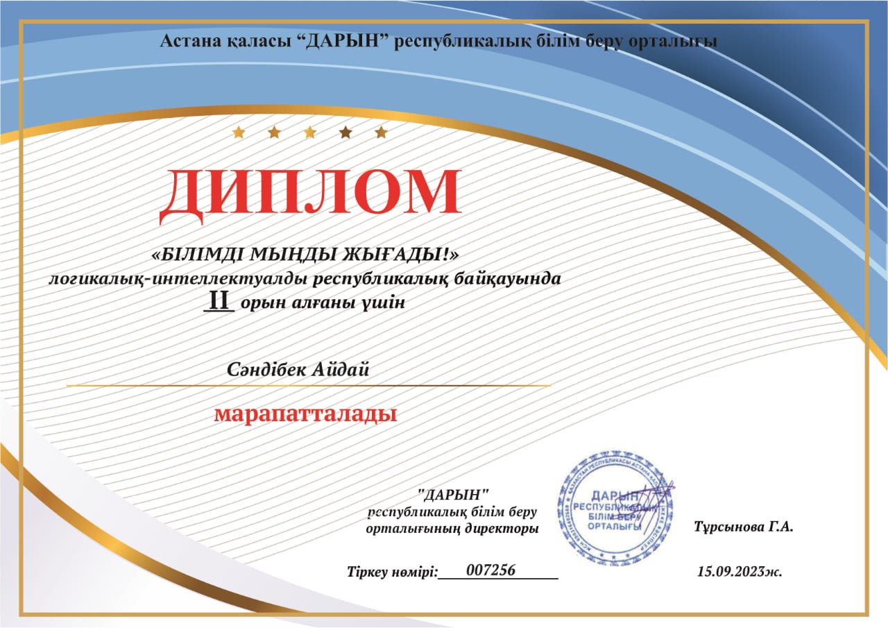 "Дарын" республикалық білім беру орталығының ұйымдастыруымен өткен "Білімді мыңды жығады" логикалық-интеллектуалды республикалық байқауына балалары қатысып, жүлделі Дипломдарға ие болған педагог-модератор Сарсенбаева Саманта Ильясовна арнайы Алғыс хатпен марапатталды.