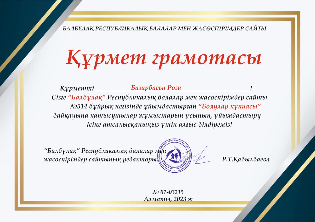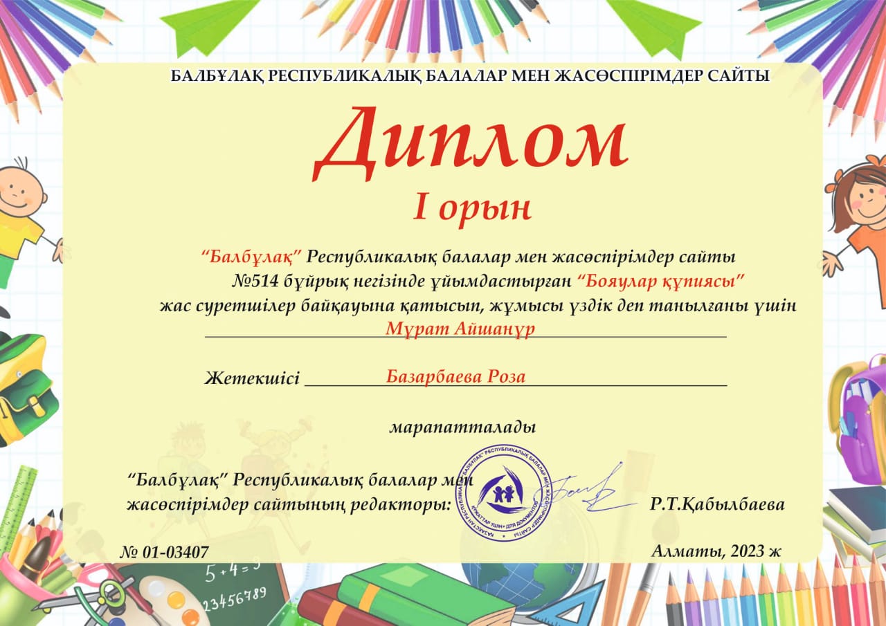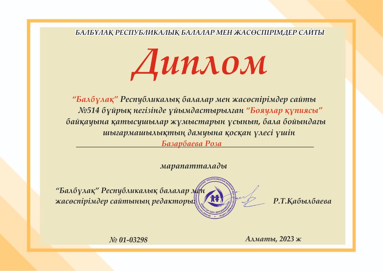 жасөспірімдер сайты N514 бұйрық негізінде ұйымдастырылған "Бояулар құпиясы" жас суретшілер байқауына қатысып, Диплом мен марапатталған балаларымыз бен Құрмет грамотасымен марапатталған кіші "Шұғыла" топ тəрбиешісі Базарбаева Роза Нұрланқызын құттықтаймыз.