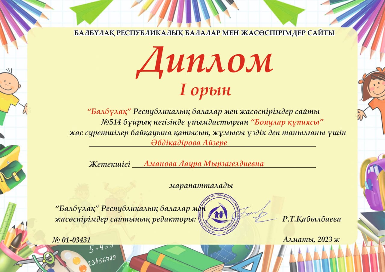№ 1 санаториялық бөбекжай-бақшасы,"Балбұлақ" Республикалық балалар мен жасөспірімдер сайты N514 бұйрық негізінде ұйымдастырылған "Бояулар құпиясы" жас суретшілер байқауына қатысып,