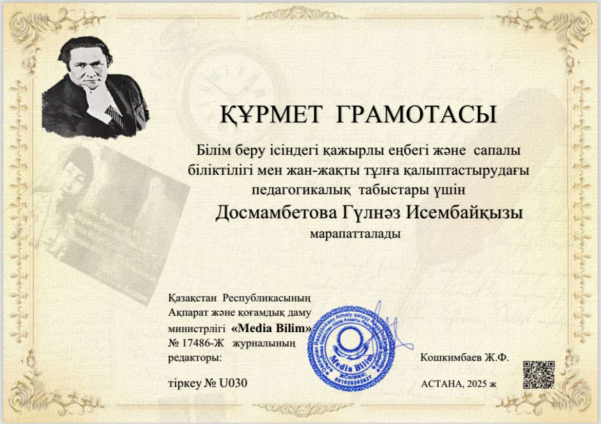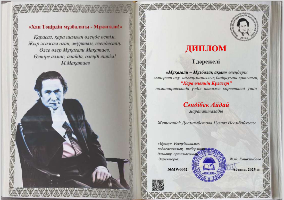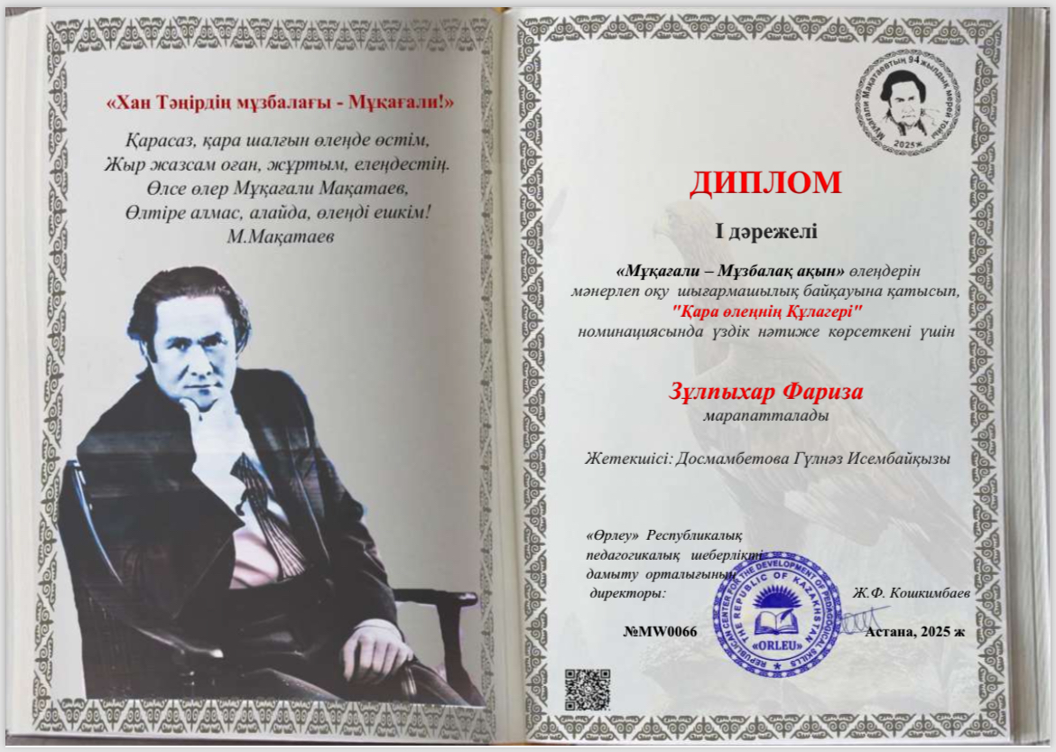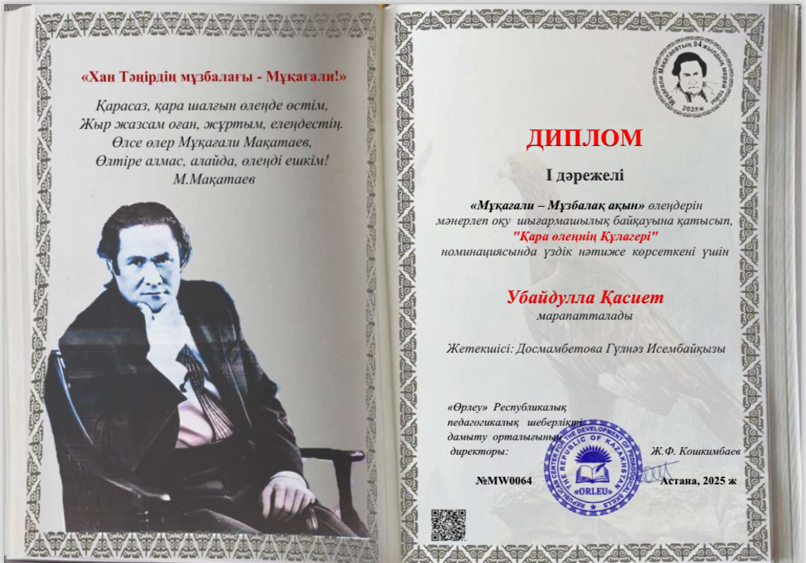 “Мұқағали - Мұзбалақ ақын” өлеңдерін мәнерлеп оқу шығармашылық байқауына қатысып,”Қара өлеңнің құлагері”номинациясында үздік нәтиже көрсеткені үшін N1 санаториялық бөбекжай-бақшасы, Мектепалды”Шапағат” топ тәрбиеленушілері жүлделі Дипломдармен марапатталды. Жетекшісі топ тәрбиешісі Досмамбетова Гүлназ Исембайқызы.