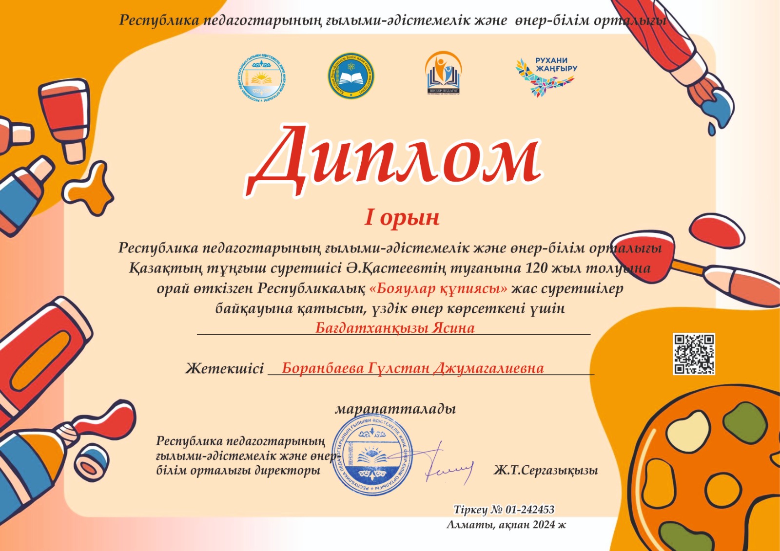 Ə.Қастеевтің туғанына 120 жыл толуына орай өткізілген Республикалық "Бояулар құпиясы"жас суретшілер байқауына қатысып,үздік өнер көрсеткен N1Санаториялық бөбекжай-бақшасы ортаңғы"Қызғалдақ" топ балалары мен тəрбиешісі Боранбаева Гүлстан Жұмағалиқызы арнайы Дипломдармен марапатталды.Өнерлі балақайларымыз көбейе берсін!
