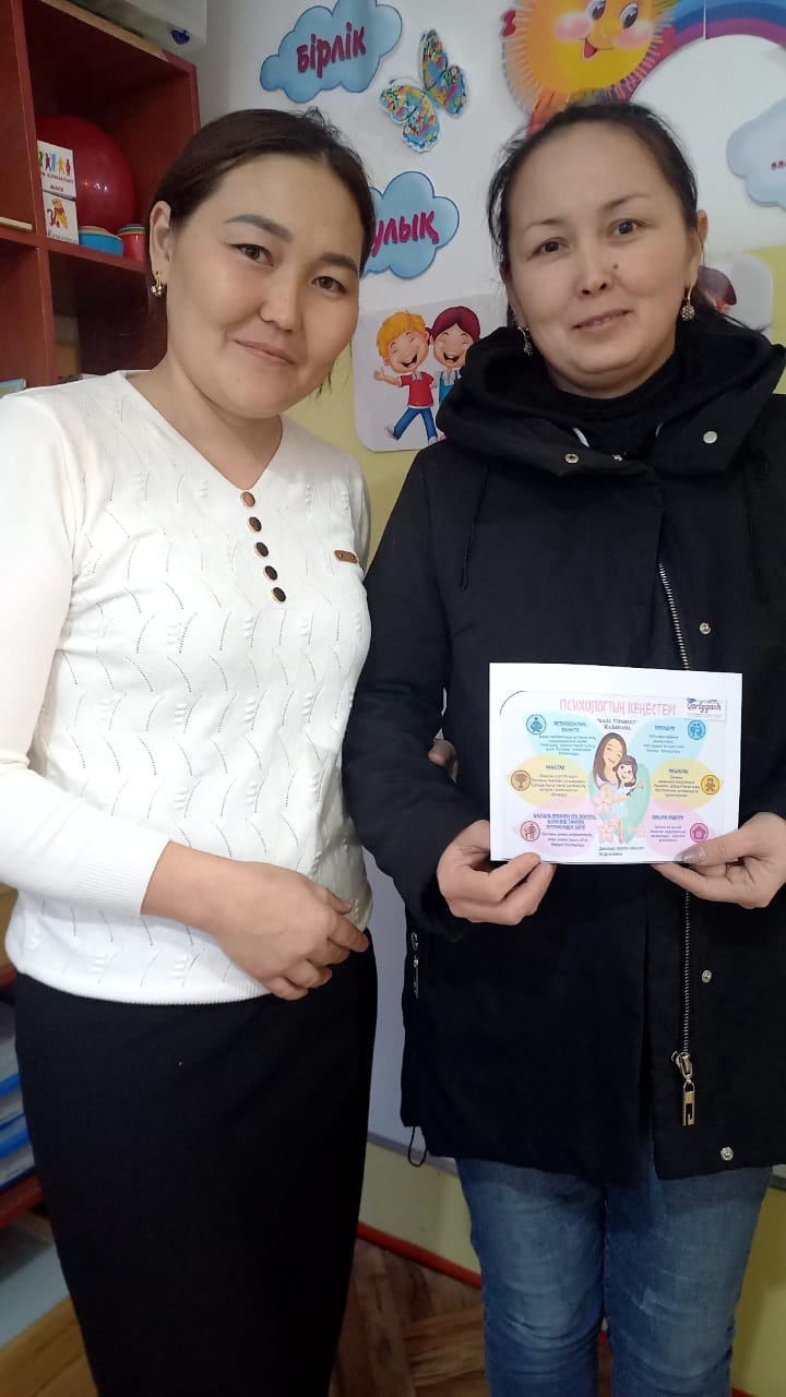 Ата-аналарға арналған консультативтік пунктің жұмыс жоспарына сəйкес педагог-психолог Дауылбаева Мархабат Жаңабайқызы өз жұмысын атқаруда.